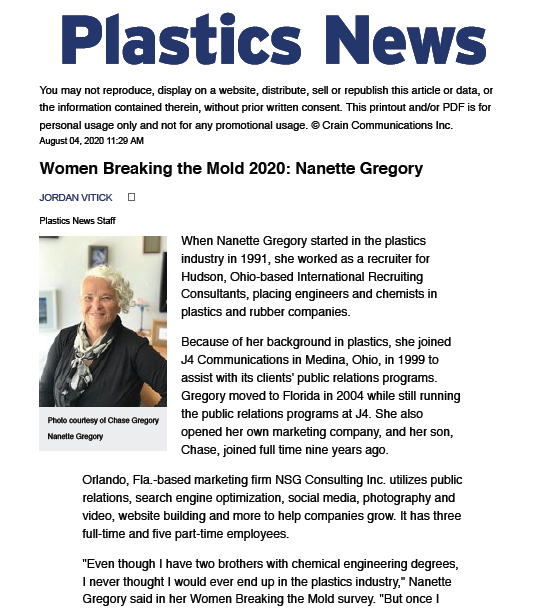 Nanette Gregory : Inside Plastics News “Women Breaking the Mold: 2020”